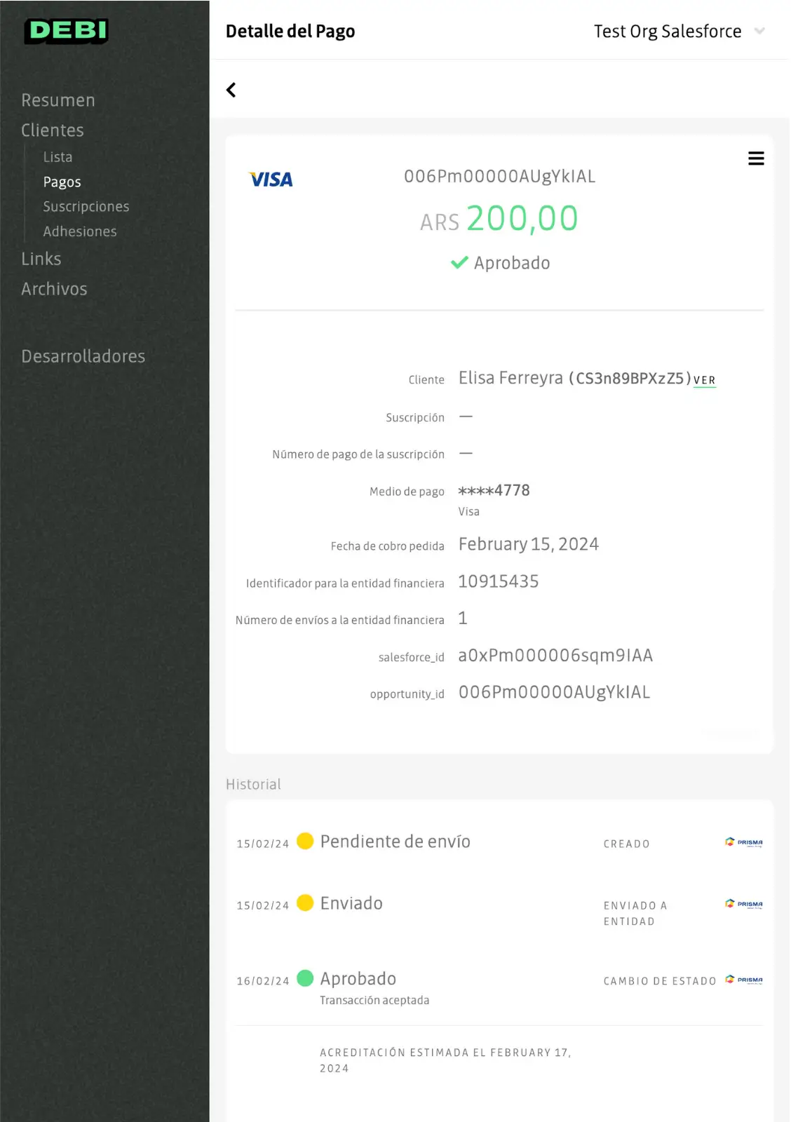 No movilices más los datos de cobranza. Con Debi hay sincronización bidireccional de datos: la evolución de tus pagos y reintentos se actualiza en tiempo real en Salesforce.